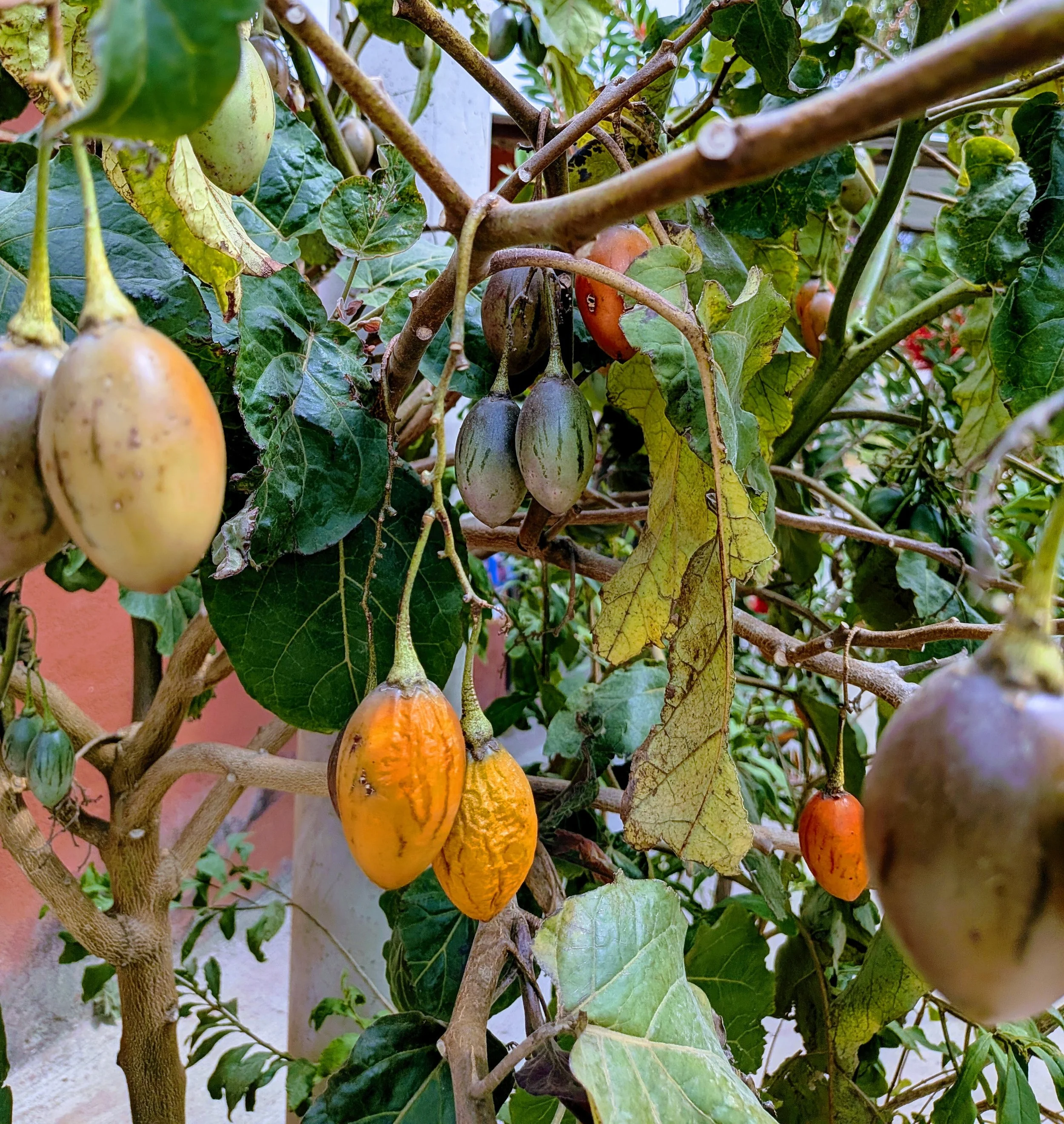 Chilltu, tree tomato, or Solanum betaceum, in my neighborhood, with fruits ranging from immature to overripe.