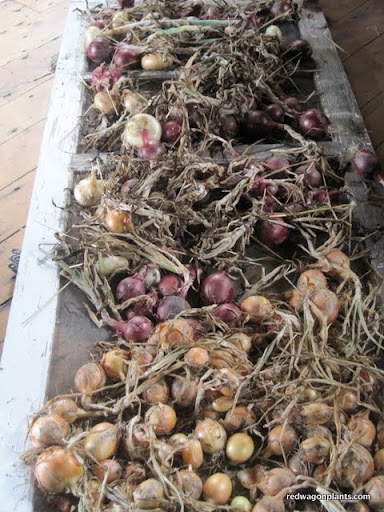 Onions: harvest the onions by pulling up the whole plant once the tops die back and start to lie on the ground. It's best to pull them up on a sunny, breezy day so that they can spend a few hours drying in the sunshine and wind. Before night falls, on that same day, bring them inside, out of direct sunlight so that they may cure for a few weeks. The curing process is what turns the outside layer of the onion into the paper-like skin. This outer layer, when dried properly, is what gives onions their real staying power as a storage crop. It is best to place onions in an airy, dark place - a garage with airflow but no direct light, an attic with air circulation, a shed, or even an extra bedroom with the curtains drawn and the windows open. You can braid the onion tops, bundle them into bunches and hang them up from the ceiling or rafters. You can also leave them in a single layer on the floor, but they must be turned over at least once a week. Once the tops are completely dried and the outer layer is paper-like, you can pull off the tops and store the onions in baskets, brown paper bags (with slits cut for ventilation), milk crates, apple crates, or cardboard boxes. Again, the important thing is to make sure the onions are in a dark place and it is well ventilated. Basements are often too humid for onion storage. In the winter, onions can go down to the low thirties and be fine. Colder temperatures better for onion storage than warmth with the ideal storage temperature being 35 to 45 degrees F.